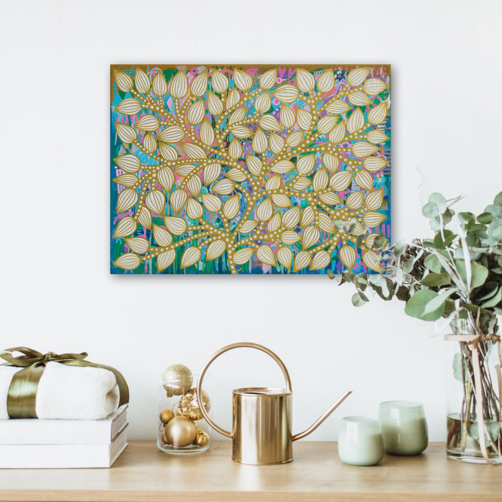 Värikästä ja voimakasta abstraktia taidetta, jossa kosminen ulottuvuus kohtaa sielukkaan herkkyyden – luotu sinulle, joka haluat tuntea tilassasi enemmän.