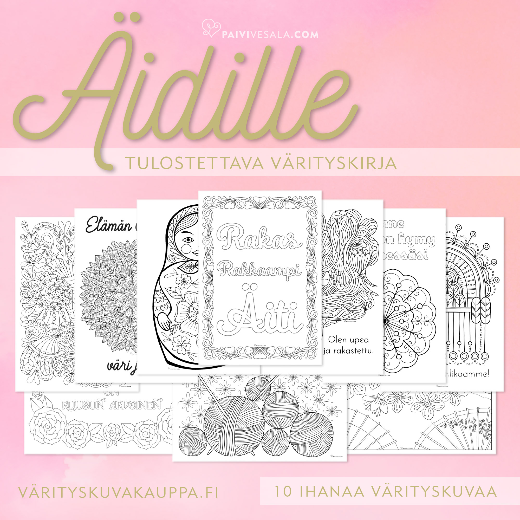 Ilahduta äitiä! Tulostettavassa värityskirjassa on 10 ihanaa värityskuvaa. Osassa värityskuvista on voimalauseita, jotka ovat kivoja vaikkapa huoneentauluina.