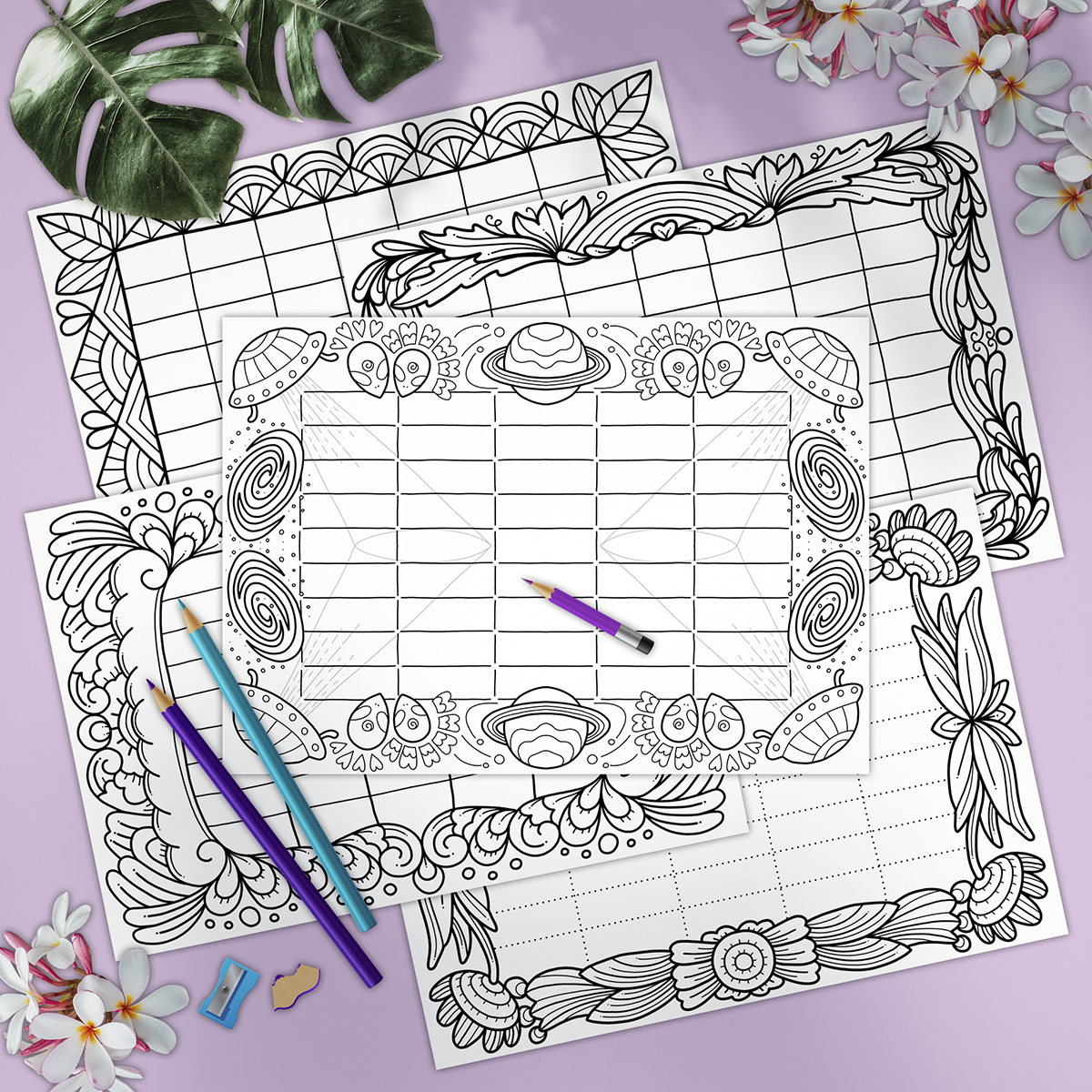 Paketissa on viisi erilaista väritettävää ja tulostettavaa lukujärjestystä. Osassa on 5 x 9 -ruudukko ja osassa 7 x 9 -ruudukko. Voit ladata pdf-arkit omalle koneellesi heti kun olet maksanut tilauksen.