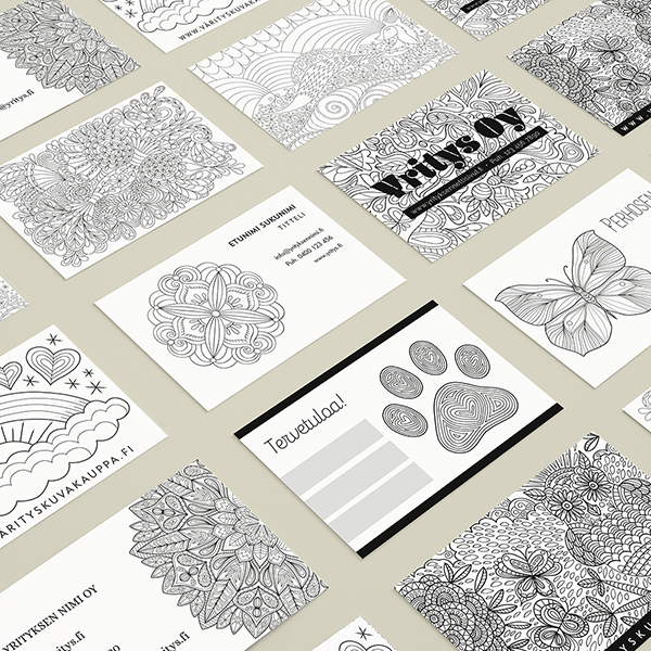 • Käyntikortin suunnittelu hyödyntäen ostamaasi värityskuvaa